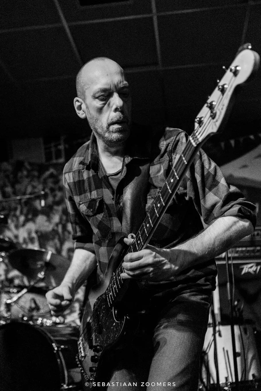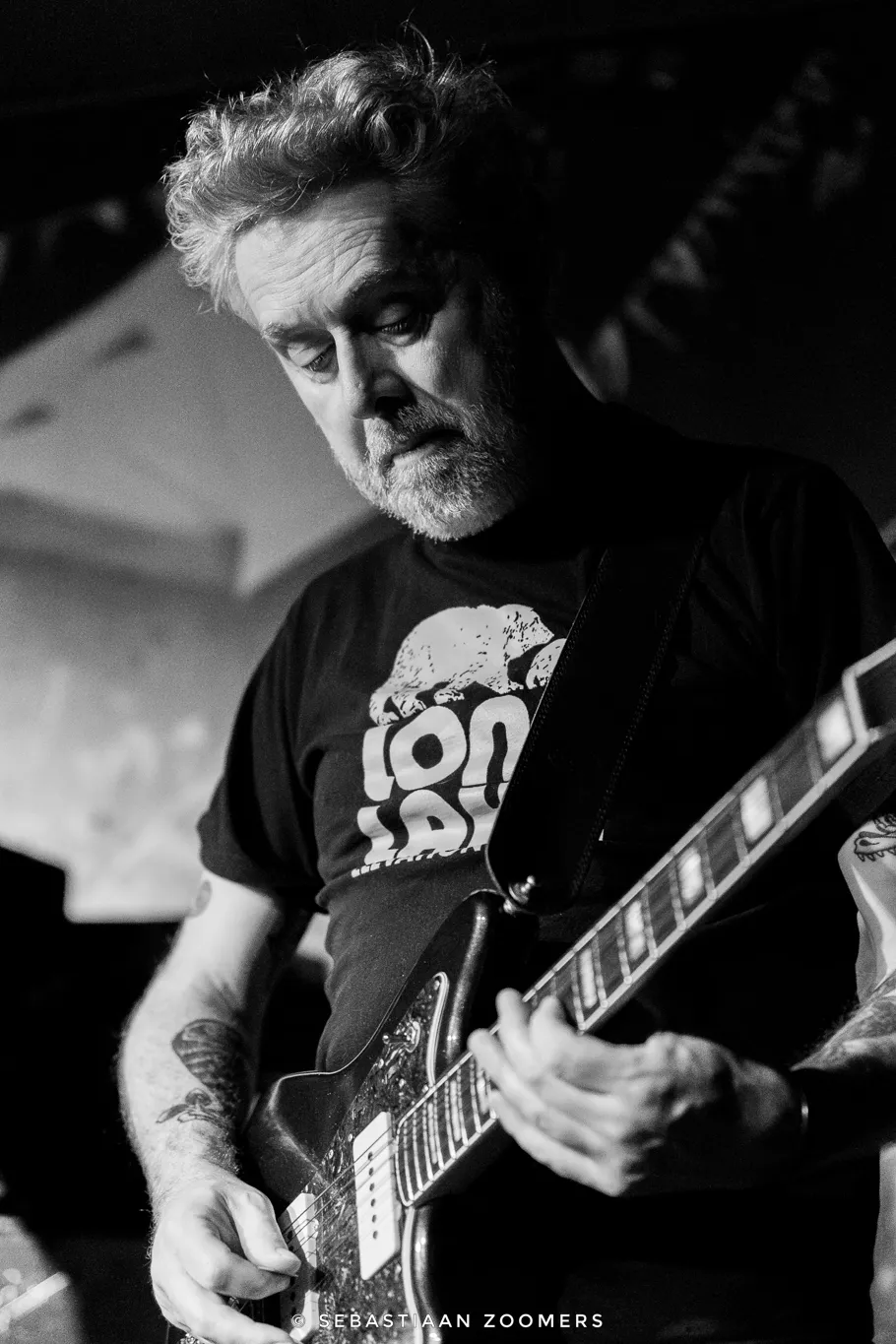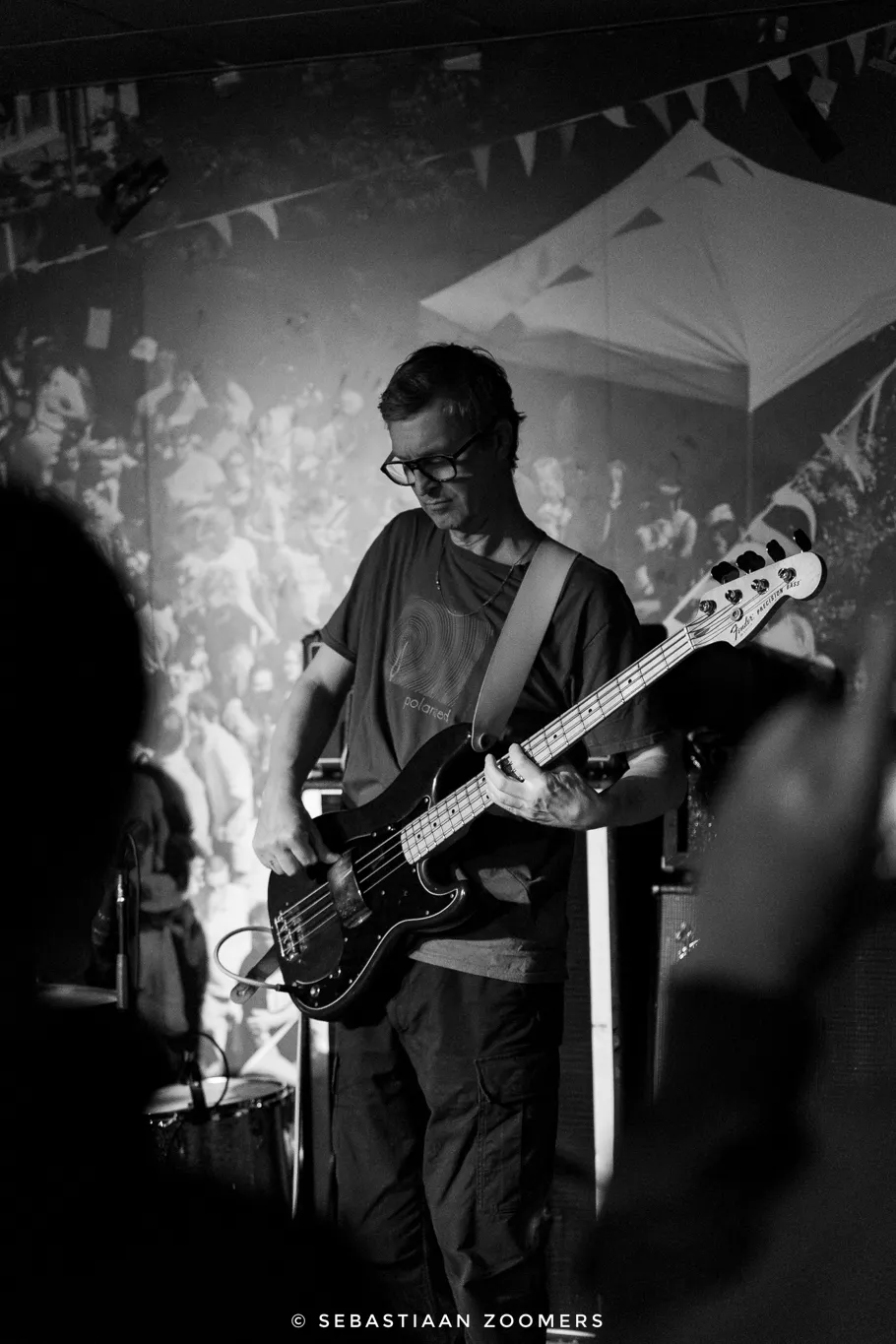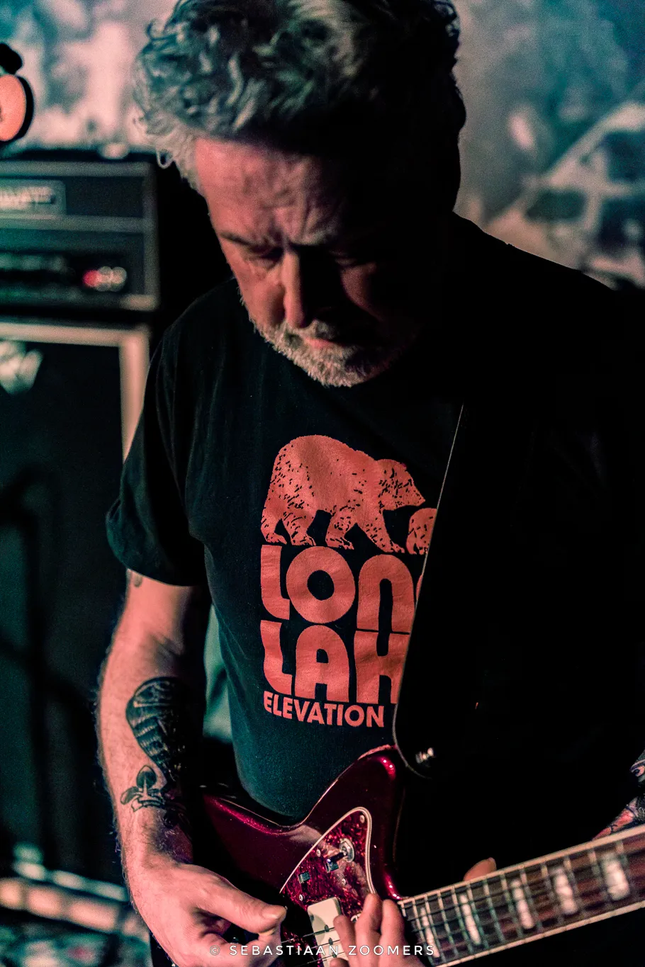 MOAN staat op een verhoging in de Schuit, die ramvol instrumenten en versterkers staat. Van de bandeden past alleen de intens grimassende drummer Reinee Huizinga erop. Voor hem op de vloer spelen bassist Andre Manning en gitarist Marcel Ennema naar elkaar gericht, Marcel met zo’n uitgebreid pedalboard dat een shoegazer zich er niet voor zou schamen. Zanger Jurgen staat een paar meter schuin voor hen. Voor hem staat een barkruk met daarop een draagbaar cassettedeck. Hij zingt het hele concert met zijn rug naar het publiek – dit is publieksinteractie van een zeldzaam minimalisme.