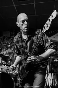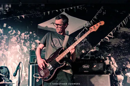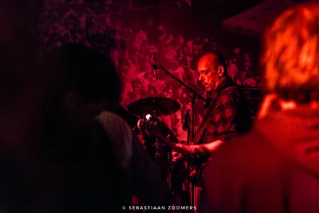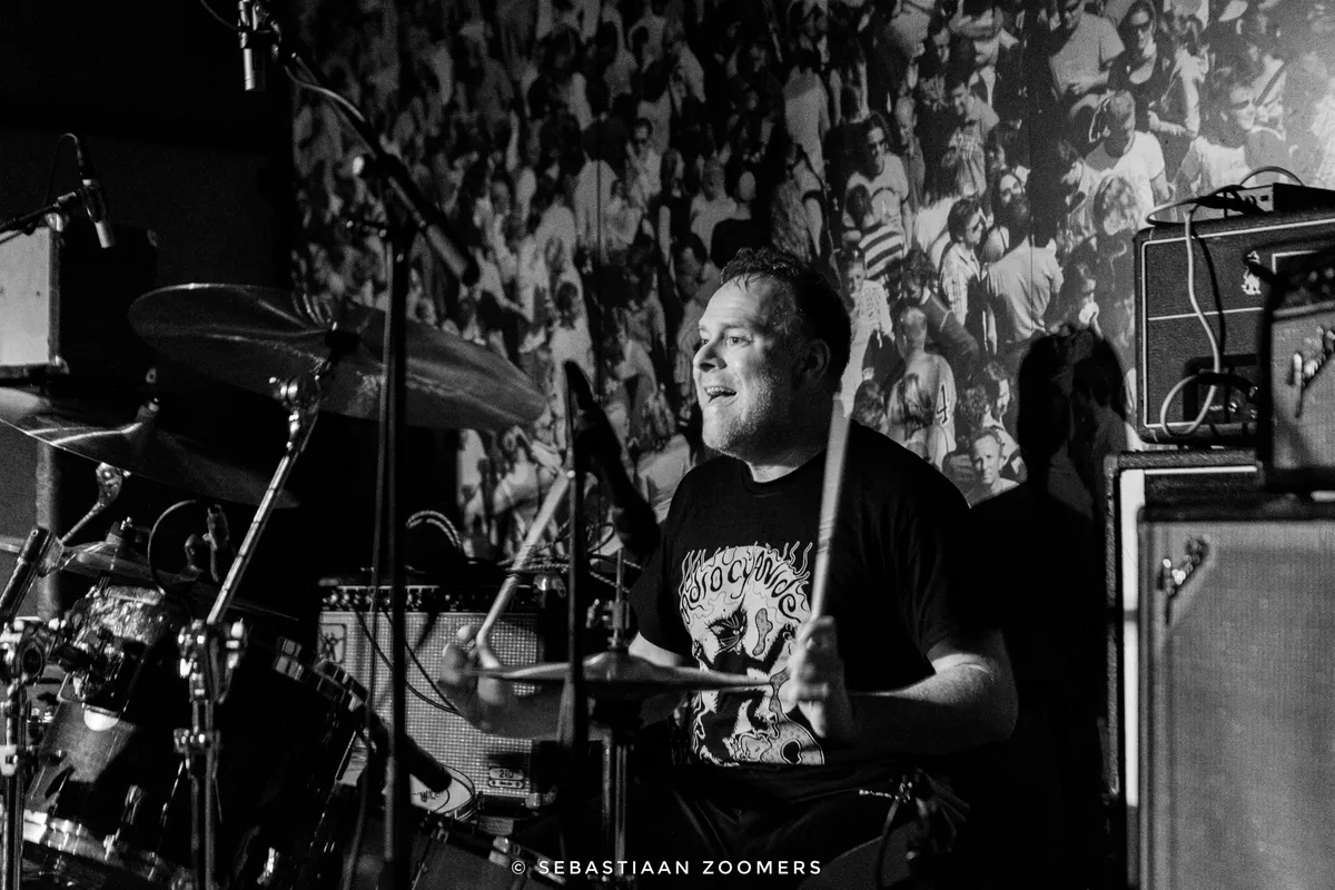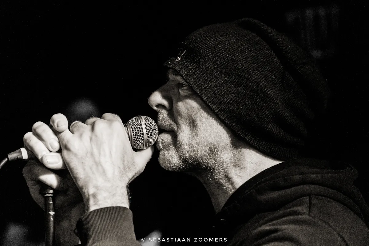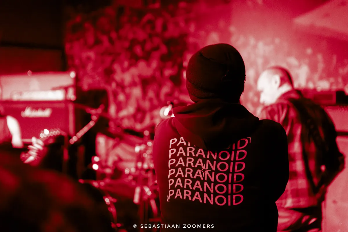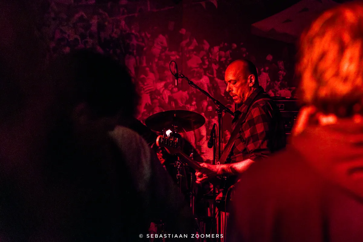 MOAN staat op een verhoging in de Schuit, die ramvol instrumenten en versterkers staat. Van de bandeden past alleen de intens grimassende drummer Reinee Huizinga erop. Voor hem op de vloer spelen bassist Andre Manning en gitarist Marcel Ennema naar elkaar gericht, Marcel met zo’n uitgebreid pedalboard dat een shoegazer zich er niet voor zou schamen. Zanger Jurgen staat een paar meter schuin voor hen. Voor hem staat een barkruk met daarop een draagbaar cassettedeck. Hij zingt het hele concert met zijn rug naar het publiek – dit is publieksinteractie van een zeldzaam minimalisme.