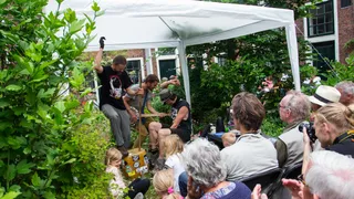 Amper bijgekomen van de eerste dag van het Leidse Hofjes Festival beginnen we aan de tweede, met nog meer acts om langs te wandelen op verschillende locaties. Deze maandag, tweede pinksterdag, voelen we de kater van de eerdere uitstorting van de Heilige Geest en proberen we onze weg tussen de regendruppels door te vinden. Het weer bleek gelukkig even gevarieerd als de louter zonnige programmering, waardoor niemand onverzadigd naar huis hoefde te gaan.